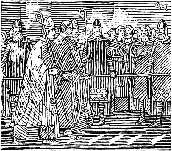 Møtet med kristendommen var ikke noe nytt for nordmennene. Funn av sjødyktige robåter tyder på at man allerede før vikingtiden hadde hyppig kontakt med øyene i Atlanteren og de britiske kystene. Som vi vet så ønsket mange vikinger et godt handelsforhold til utlandet og slik sett så blir navnet viking i den forstand vi er vant til å bruke den nokså feil. Da de kristne fryktet de nordiske hedningenes tro og påvirkning lot mange av disse vikingene seg såkalt primsigne for å bedre forholdet til sine handelspartnere. Primsigning var egentlig et forberedelsesrituale til dåpen hvor en prest drev ut onde ånder og demoner av hedningene slik at de ble ”rene”, uten at de måtte forlate sin egen tro. De færreste lot seg til slutt døpe, men at de var primsignet gjorde de lettere å akseptere og det ble opplevd som tryggere å ferdes sammen med dem for de kristne. For de norske områdene var det de engelske øyene som skulle få størst betydning, mens det for Sverige og Danmark var de tyske områdene som påvirket sterkest når det gjaldt kristen påvirkning. Mest kjent er munken som er blitt kalt Nordens apostel, Ansgar, som drev misjon i disse landene på 800-tallet. Det var Harald Hårfagres sønn Håkon den gode, som vi kjenner som, Håkon Adalsteinsfostre, som rundt 930 var den første kongen som aktivt drev misjon i Norge. Landet var siden 800-tallet forsøkt kristnet av misjonærer fra Europa og også omvendte vikinger. Men det var med misjonskonger som Olav 1. Tryggvason og Olav 2. Haraldsson at kristningen av landet virkelig fikk vind i seilet. De angrep den norrøne troen ved å forby kulten, den felles dyrkingen av guder og åndelige vesener som hadde samlet folk om troen. Dåpen ble en tvungen handling og det samme ble også begravelsene som ble lagt til kirkegårder og ikke lenger knyttet til gravhauger i nærheten av store gårder. Kvinnene som hadde en sterk og viktig stilling i det norrøne samfunnet mistet mye av sin stilling da de ikke lenger fikk lede religiøse ritualer, deres status ble knyttet til jomfrudom og i praksis ble de lagt under mannens kontroll da kvinnens kjønn ble ansett som urent på grunn av fødsler, menstruasjon og seksualitet. Les mer om dette i den korte fordypingsartikkelen om kontinuitet og brudd i religionen.