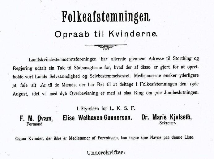 Høsten 1905 ble det holdt forhandlinger mellom de to regjeringene halvveis mellom de to hovedstadene i byen Karlstad i Sverige. Svenskenes holdning var å redde den ære som reddes kunne. Forhandlingene skulle handle om en eventuell unionsoppløsning og hvordan den måtte lede til store nok gevinster til at det hele kunne sies å ha gått i deres favør, eller i det minste rettferdig for seg. Den norske holdningen var at unionen allerede var oppløst og at forhandlingene gikk ut på å finne ut hva som skulle avses Sverige som kompensasjon. Folkeavstemningen var det første kravet som ble oppfylt fra norsk side, faktisk kom man svenskene litt i forkjøpet. På rekordkort tid var en landsomfattende avstemning blitt holdt med et overveldende flertall for selvstendighet: 368208 menn stemte for, 184 i mot. Vel, i mot og i mot, spørsmålet var stilt slik at man stemte over hvorvidt man godtok en unionsoppløsning som allerede hadde skjedd; er du «enige i den stedfundne opløsning af unionen», men hva gjorde vel det? For å vise at også kvinnene stod bak avgjørelsen startet kvinnebevegelsen en underskriftskampanje landet ikke hadde sett maken til.